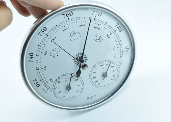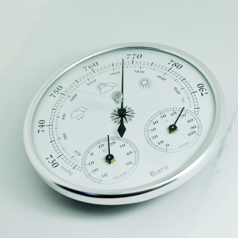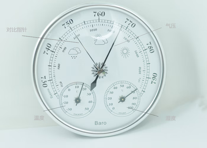 3.看气压变化:由于各地气压不同,指针显示位置不同,某些地区也有可能遇到气压很低的指针偏到底下超出量程的情况的(内陆地区和高海拔地区,气压偏低,指针在量程范围外的情况较多。)。气压变化变化更缓慢,一般要天气由晴转雨或由雨转晴的时候,才会变化明显,所以拿到没看到气压针动,请将对比指针转到和气压指针同一个位置,然后耐心等待几天就行了。