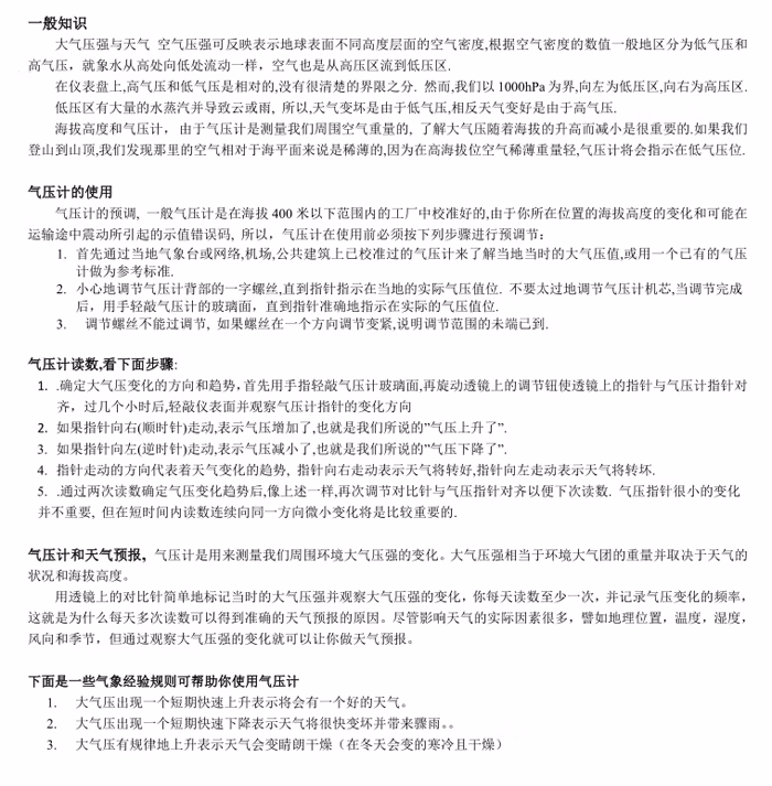 测量范围(Measure ange):960~1060hPa (百帕),-30~50℃ ,0~Rh; 提醒,气压指针有时候会左边到底或者右边到底,并不是产品问题,而是当地本身气压指示过量程了。观察气压,需要放几天,天气阴雨转晴或者晴转雨等时候才变化幅度比较大。请勿凭直观感觉判断,可以用带探头的设备对比下,会发现基本上是一致的。